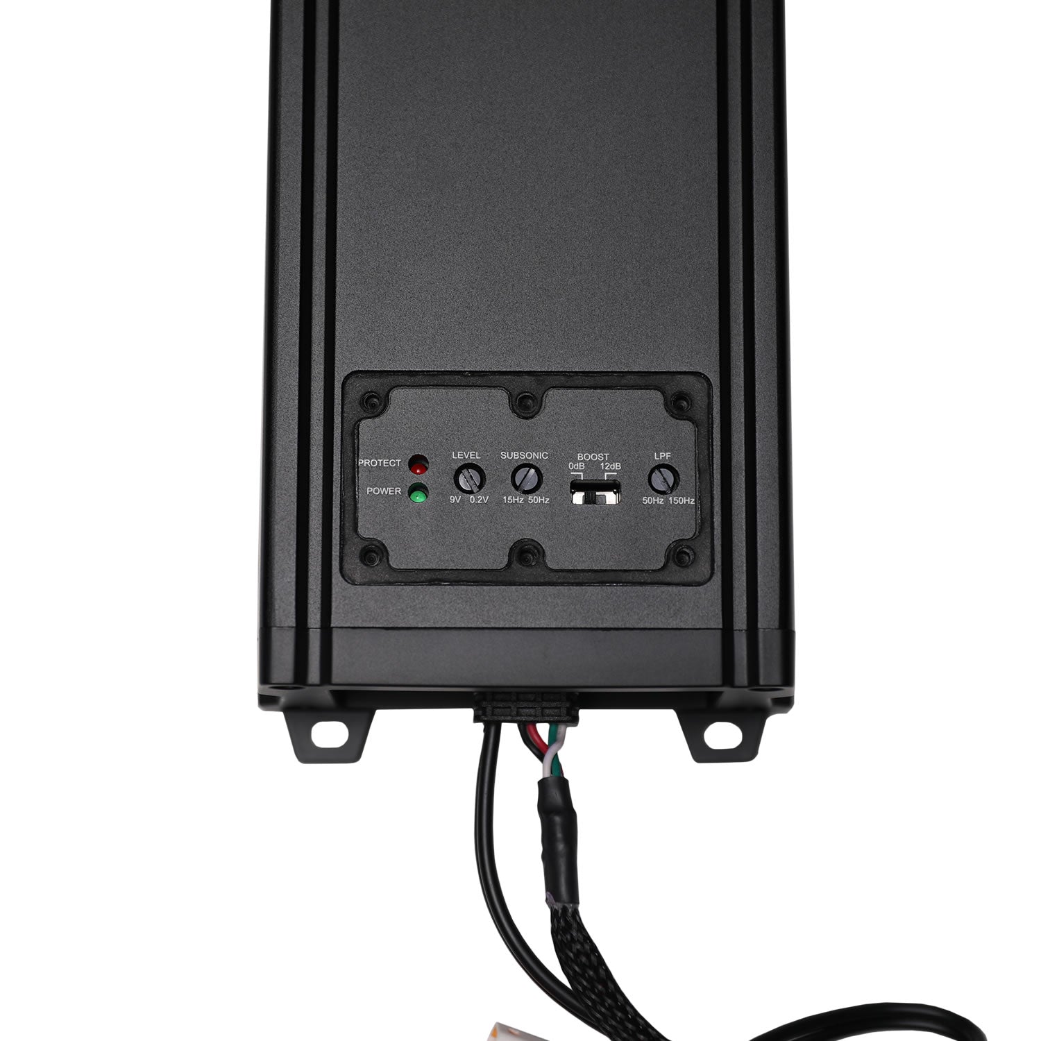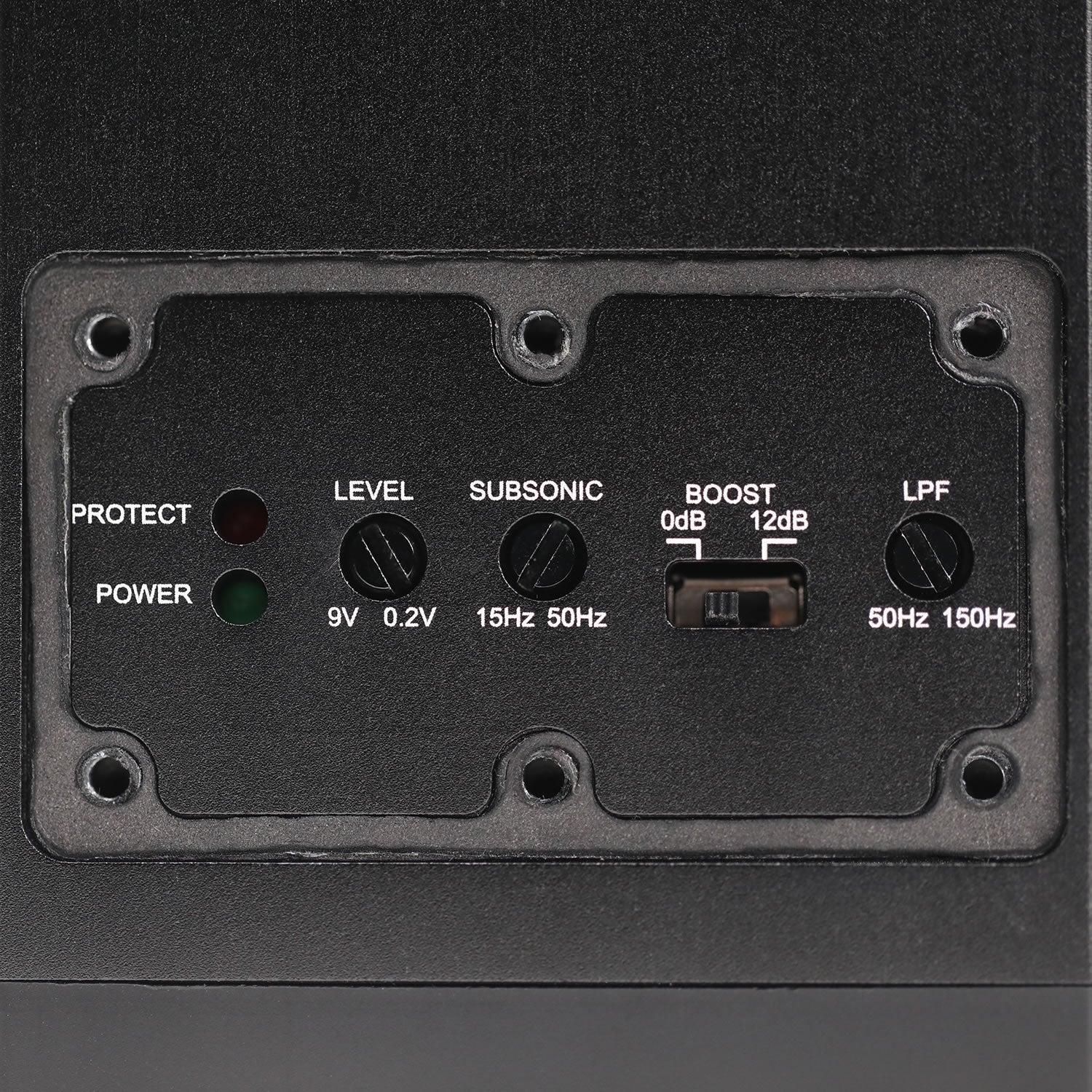 - Top-mounted sealed controls for bass boost, input sensitivity, and crossover tuning